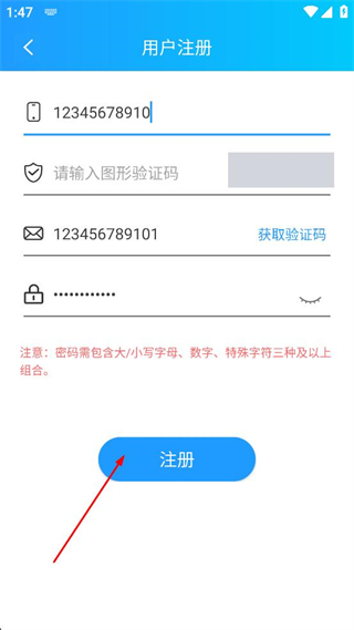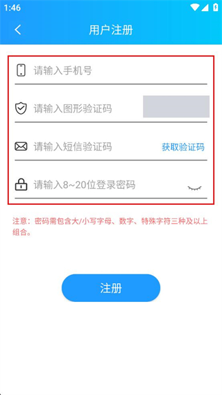 3、进入用户注册页面,依次填写手机号、图形验证码、短信验证码,再设置符合要求的登录密码。