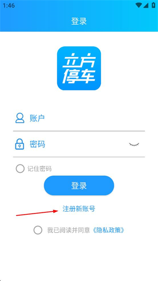 2、进入立方停车登录页面,找到注册新账号选项并点击,同时勾选我已阅读并同意隐私政策选框。