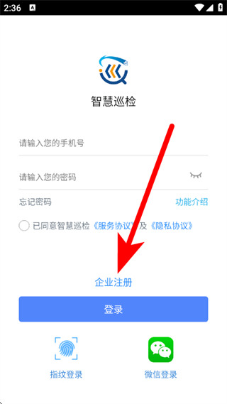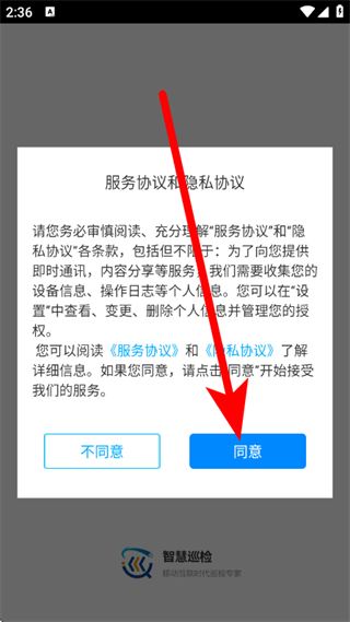 1、打开智慧巡检,在弹窗中点击同意,进入登录页面。