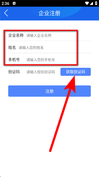 3、在企业注册页面,输入手机号码等信息,点击获取验证码。