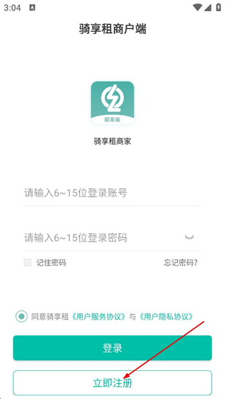 1、在骑享租商家首页,点击立即注册按钮,即可进入注册页面。
