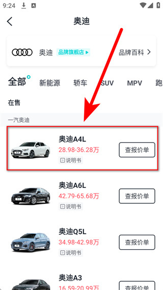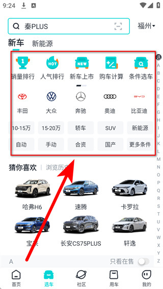 2、在选车页面中,通过筛选条件,定位到目标品牌分类。
