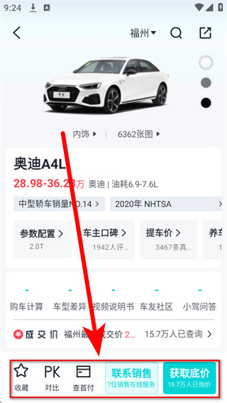 4、在车型详情页面,可点击功能按钮,查看车型价格、咨询购车相关信息。