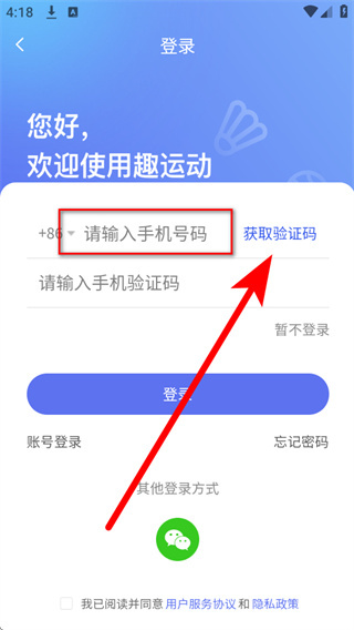 3、在登录页面的手机号码栏填写手机号,点击获取验证码。