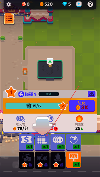 4、查看碰碰车收益为15/h,可消耗3K资源点击进化提升设施等级。