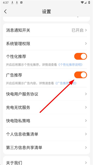 3、在设置页面里,找到广告推荐选项对应的开关按钮,点击右侧的开关,将其切换为关闭状态,即可关闭成功。