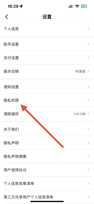 3、在设置页面中,找到隐私权限选项并点击,进入隐私权限的专属设置页面。