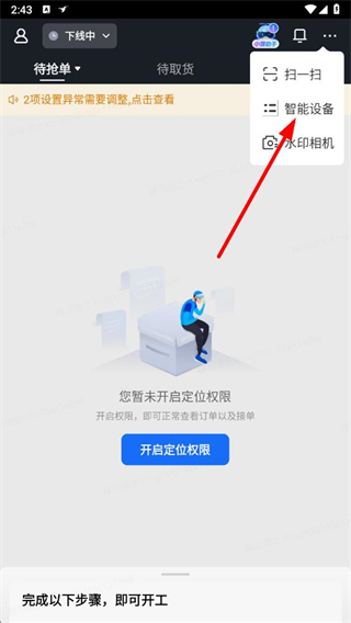 1、打开蜂鸟众包APP,点击右上角三个点,在选项中点击智能设备。