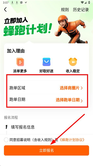 3、在页面选择跑单区域与跑单日期,同意协议后,点击立即报名按钮,即可完成蜂跑计划的加入。