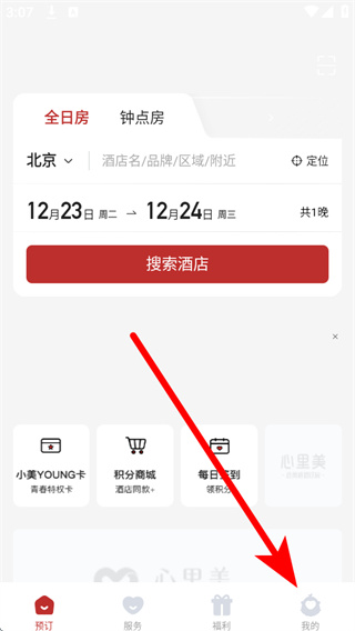 1、打开心里美酒店预订,点击底部导航栏的我的,进入个人中心页面。