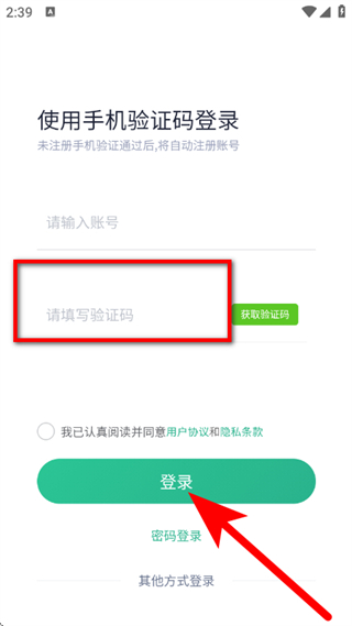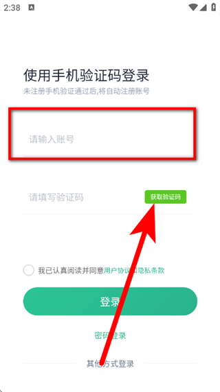 3、在手机验证码登录页面,输入手机号,点击获取验证码。
