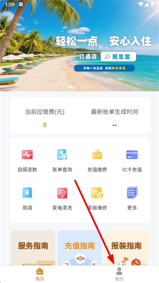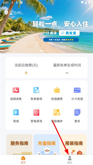 2、在APP主界面,能看到各类民生燃气业务功能入口,点击页面右下角“我的”选项,进入个人中心页面。
