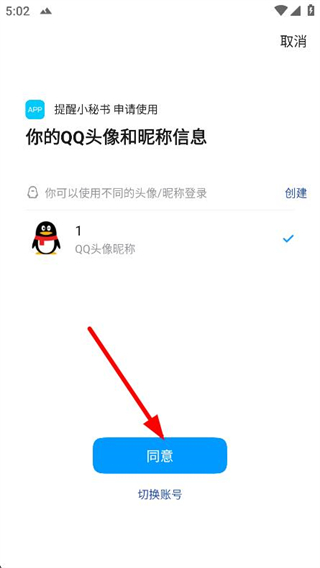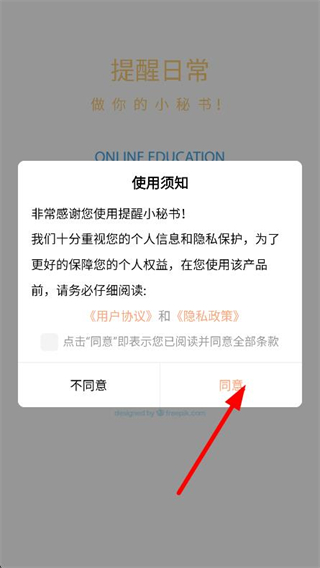 1、打开提醒小秘书app,在弹出的页面,点击同意。