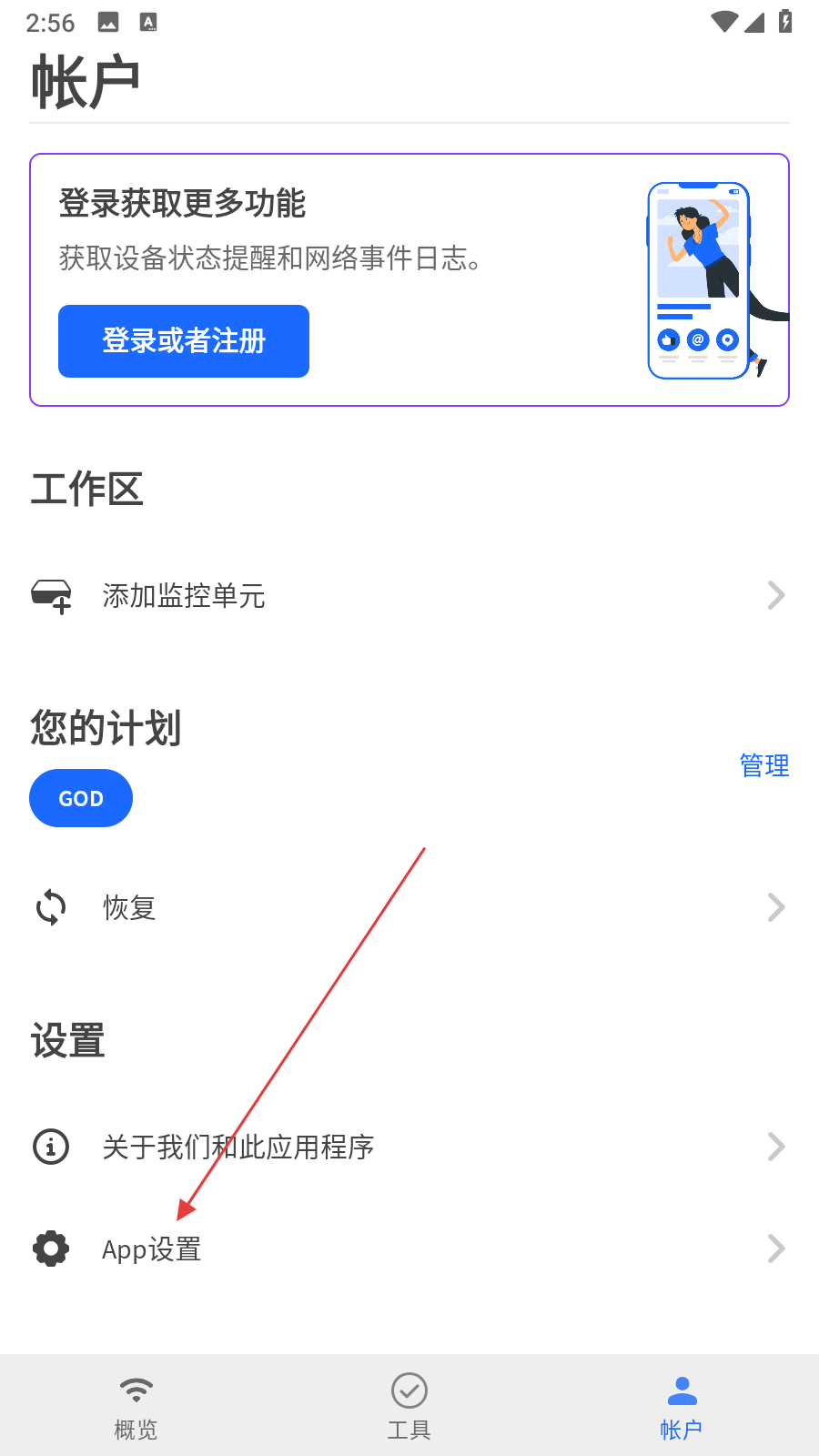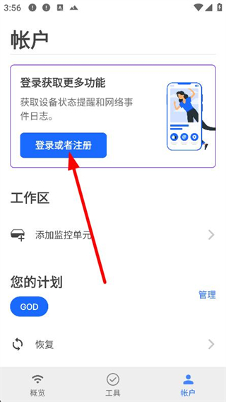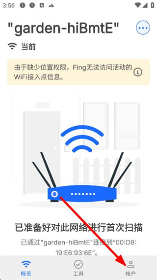 1、打开fing网络扫描仪APP,点击底部导航栏最右侧的帐户选项,进入帐户页面。