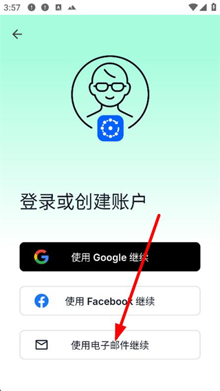 3、在登录或创建账户页面,点击使用电子邮件继续。