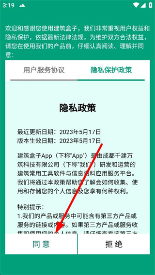 1、打开建筑盒子app,在隐私政策弹窗中点击同意。