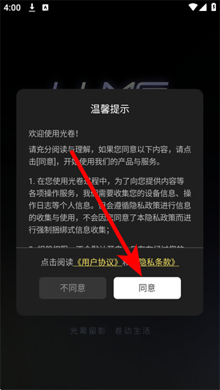 1、打开光卷,在弹出的弹窗中点击同意,进入应用首页。
