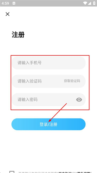 4、填写手机号、获取并填写验证码、设置密码后,点击登录/注册,完成账号注册。