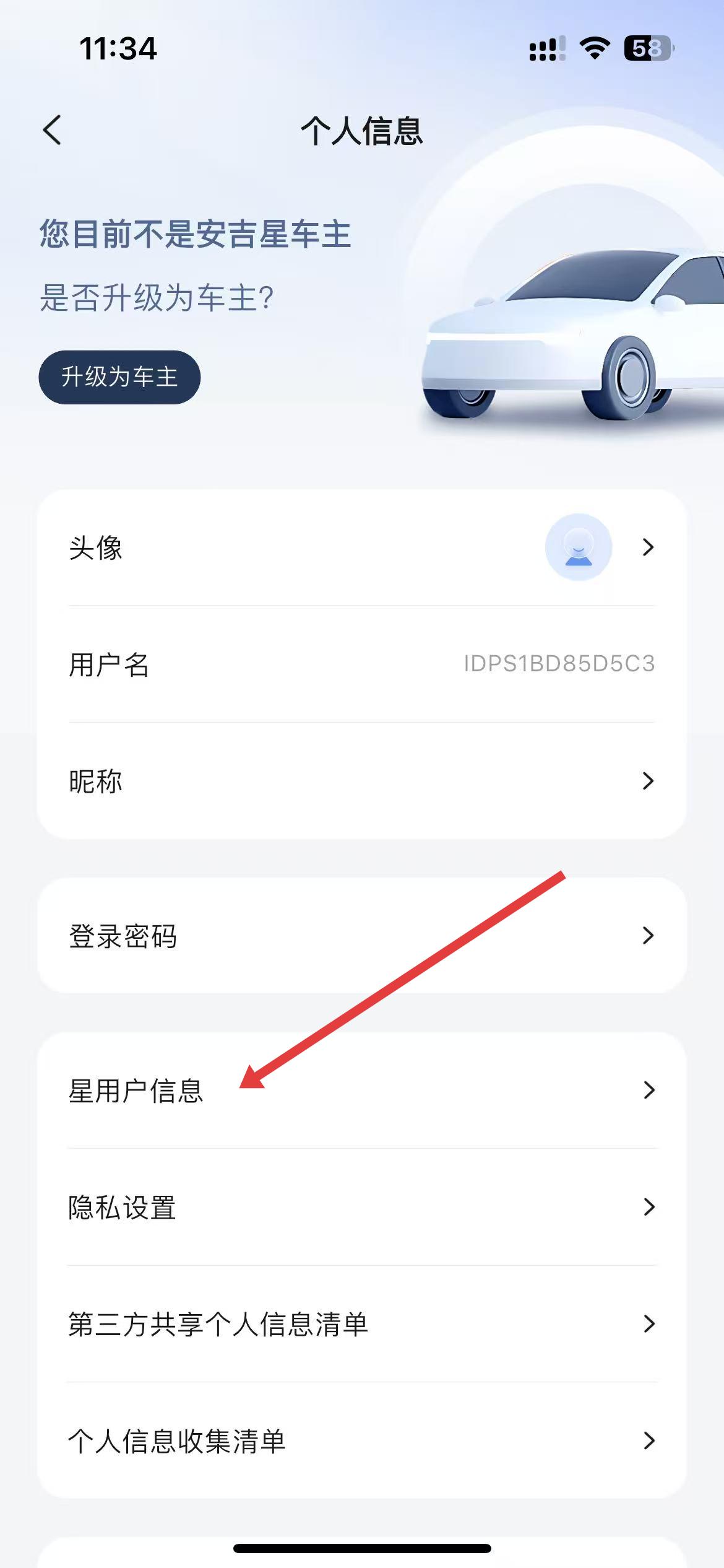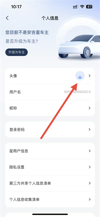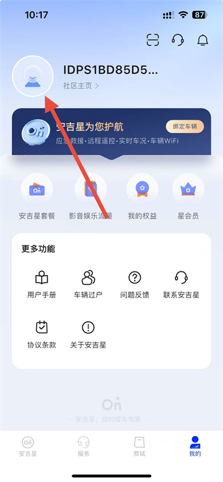1、打开安吉星APP,点击底部导航栏中的我的,点击头像区域进入个人信息界面。