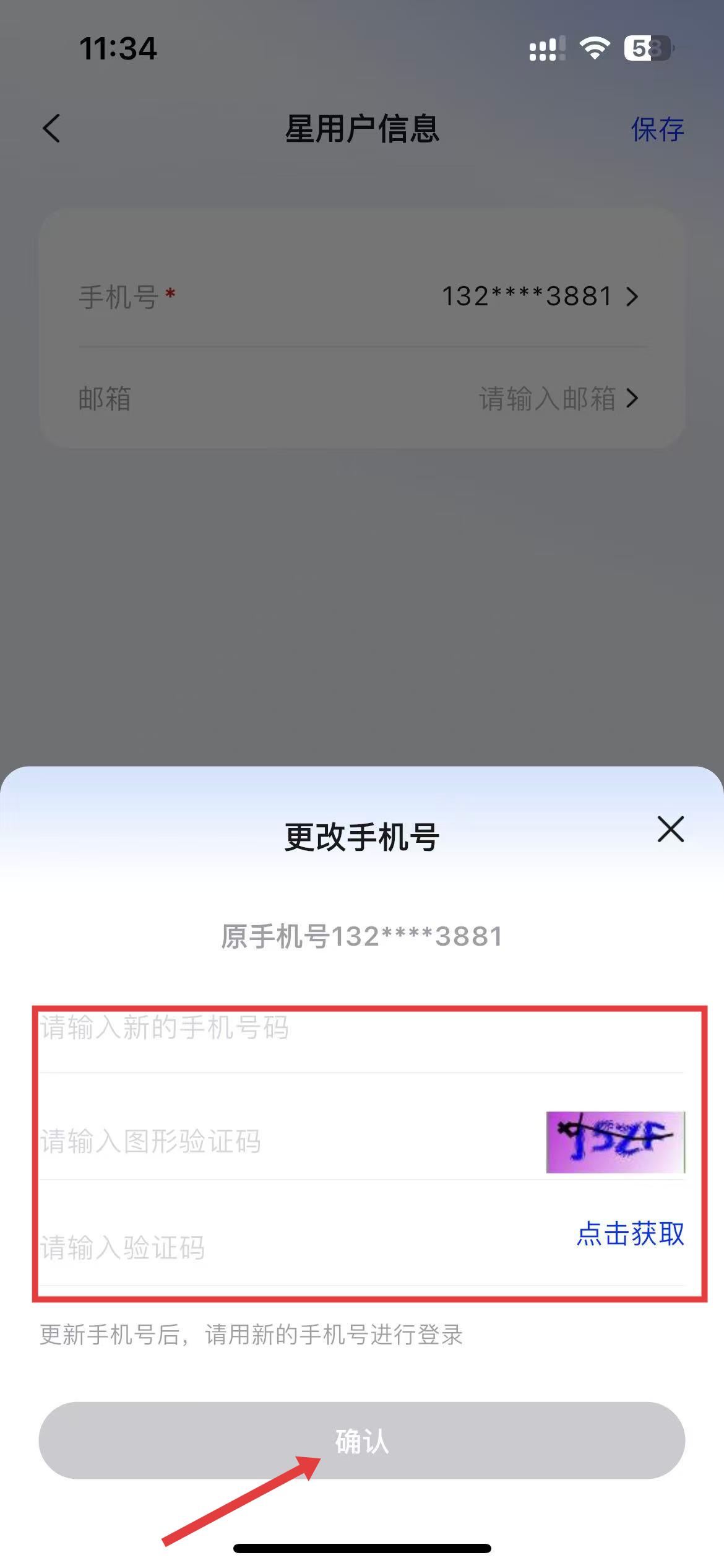 4、在更改手机号界面,输入新的手机号码、图形验证码,获取验证码,最后点击确认即可完成手机号码的更换绑定。