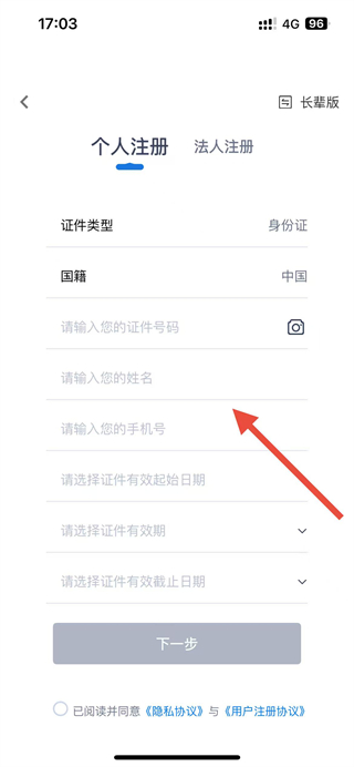 4、在注册页面中,依次在输入框填入信息,勾选同意后,点击下一步,完成后续操作即可注册账号。
