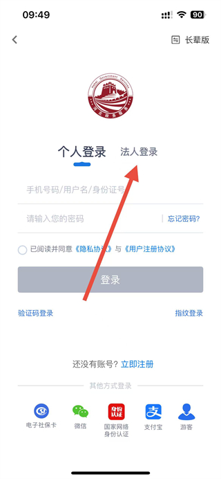 2、在登录页面中,点击切换至法人登录标签,进入法人账号的登录页面。