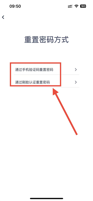 4、在重置密码方式页面,选择通过手机验证码重置密码或通过刷脸认证重置密码,按提示完成密码重置。