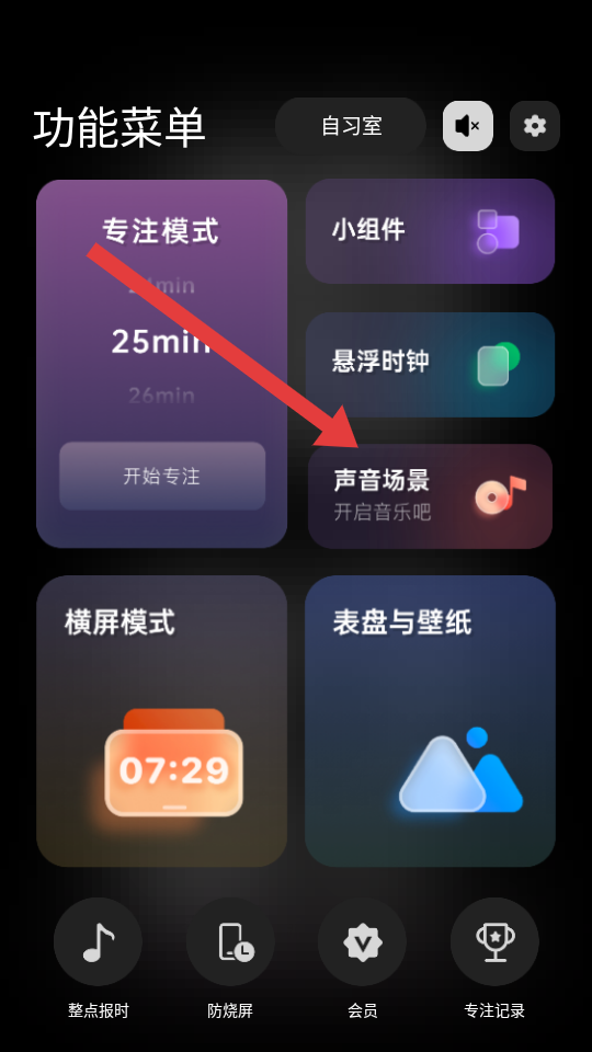 1、在翻页时钟的功能菜单界面,点击声音场景选项,进入声音场景选择页面。
