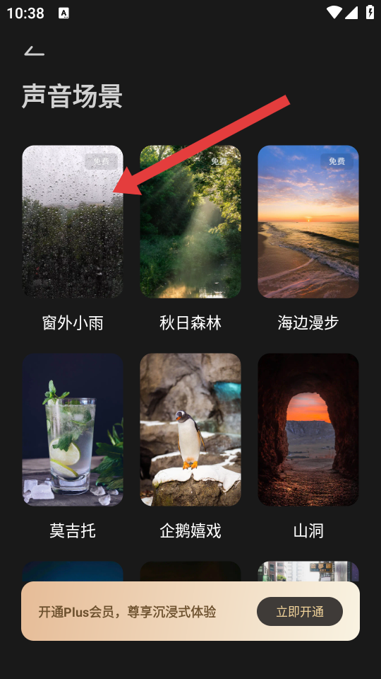 2、在声音场景的页面,点击要播放的声音场景卡片,进入该场景的详情界面。
