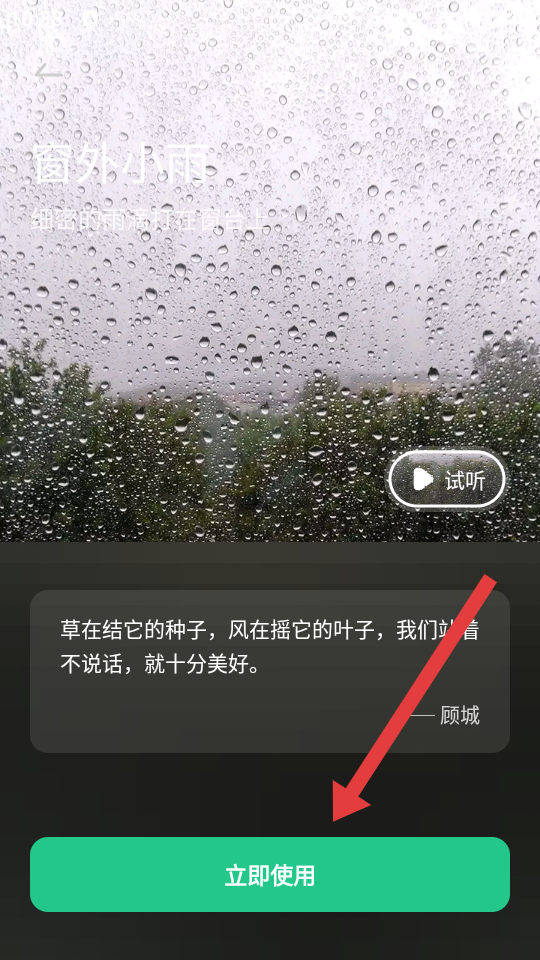 3、在声音场景详情界面,点击立即使用按钮,触发音乐播放设置。