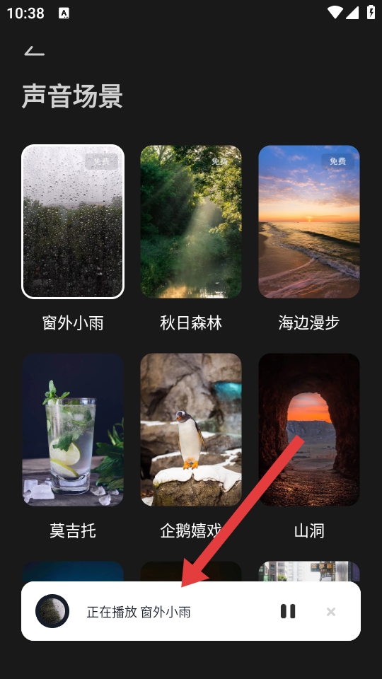 4、返回声音场景页面,底部出现正在播放窗外小雨的提示栏,即成功开启音乐播放。
