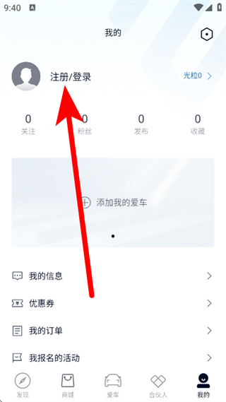 2、在个人中心页面,点击注册登录,进入注册登录页面。