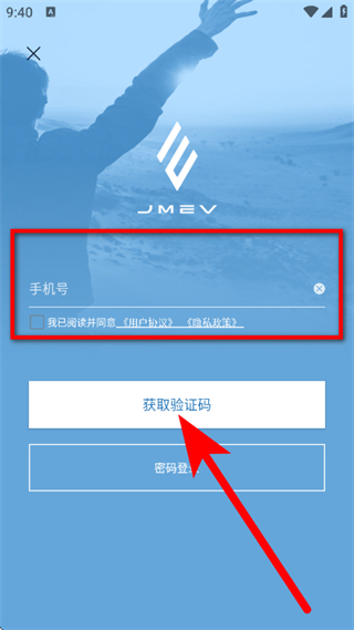 3、在注册登录页面,输入手机号,勾选后,点击获取验证码。
