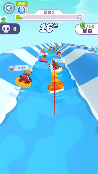 2、进入游戏后,操控角色乘坐泳圈在水滑道中前进,跟随滑道方向调整移动轨迹。
