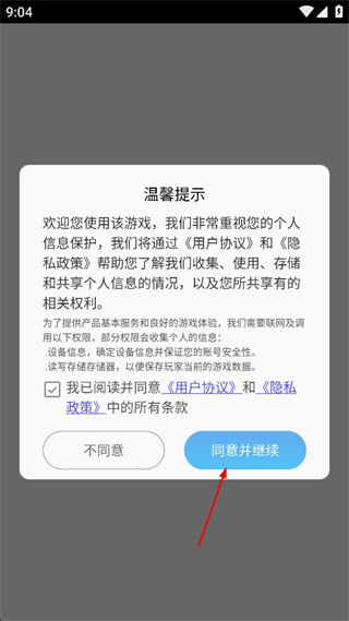 1、查看游戏弹出的温馨提示,勾选我已阅读并同意相关条款的选项,点击同意并继续按钮。