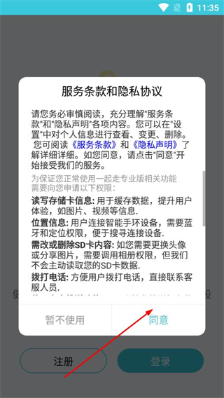 1、打开一起走专业版,在服务条款弹窗中点击同意。