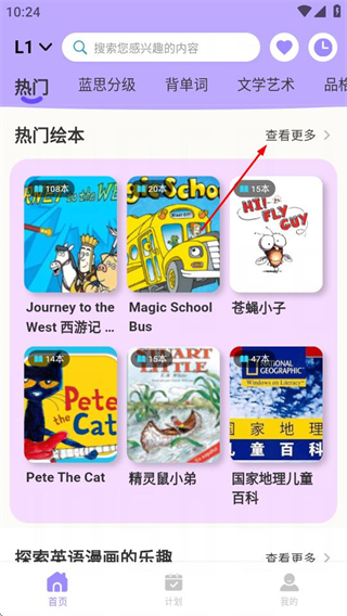 1、在绘芽首页,点击热门绘本旁的查看更多可进入热门绘本列表页。