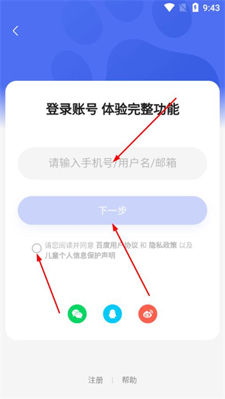2、输入手机号/用户名/邮箱,勾选同意相关协议,点击下一步。