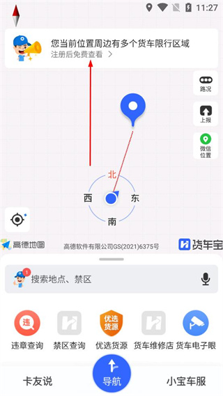 1、打开货车宝导航APP,在主界面找到注册相关入口,点击该入口进入注册页面。