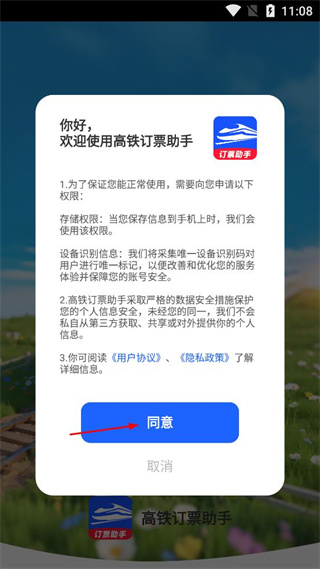 1、打开高铁订票助手,查看弹出的权限申请提示,点击界面中的同意按钮进入应用。