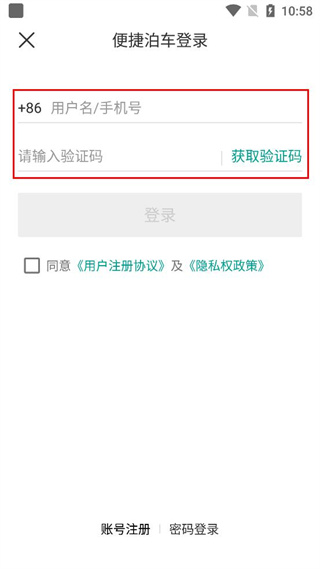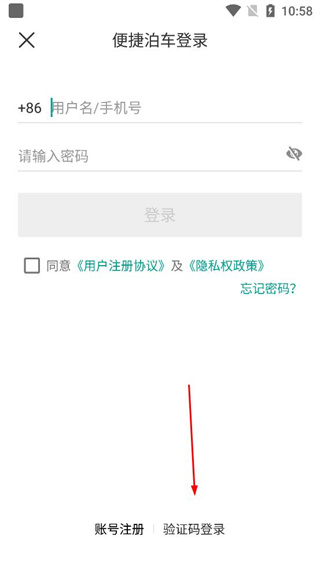 2、进入便捷泊车登录页面后,选择验证码登录方式,切换到对应的登录信息填写界面。