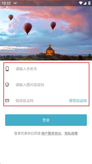 3、在登录界面依次填写手机号、图形验证码,再点击获取验证码按钮等待短信验证码。