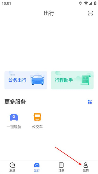 2、进入应用后,在出行页面找到底部导航栏的我的选项,点击该选项进入个人相关界面。