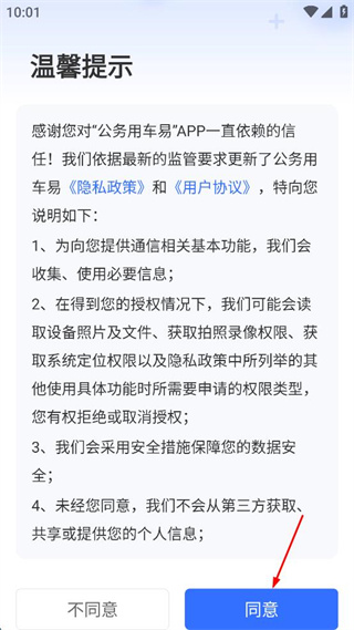1、打开公务用车易APP,查看弹出的温馨提示内容,点击界面下方的同意按钮进入应用。