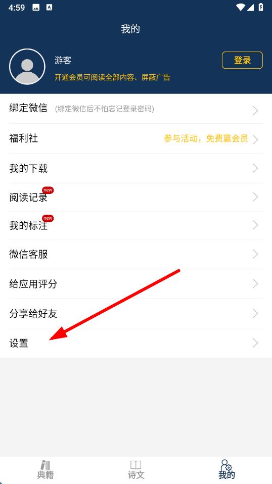 1、打开古文典籍大全app,点击底部导航栏最右侧的我的选项,进入个人页面。