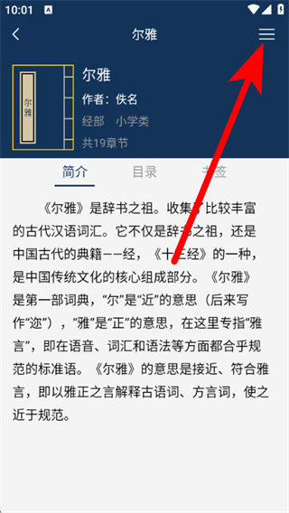 3、在典籍详情页面,点击右上角三条横线的菜单按钮,展开功能菜单。
