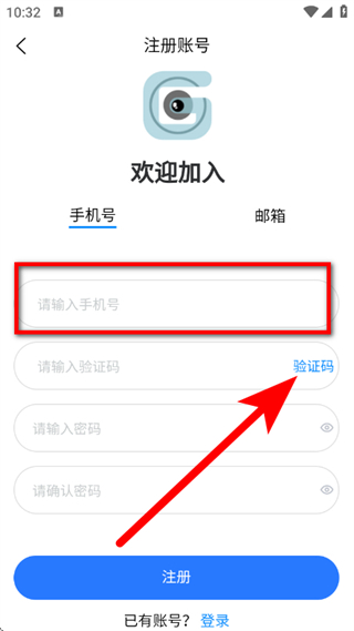 3、在注册页面,输入手机号,点击获取短信验证码。