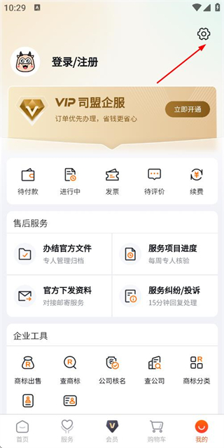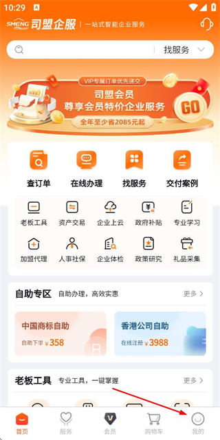 1、在司盟企服首页点击底部我的选项,进入个人中心页面。