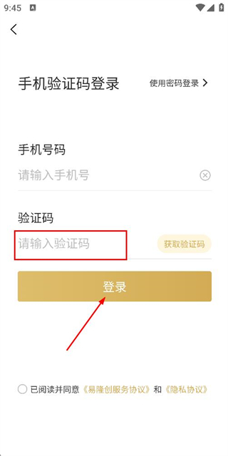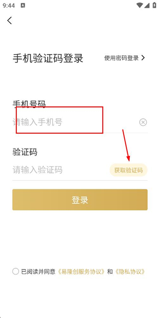 2、在手机登录页面填写手机号,勾选协议后,点击获取验证码。
