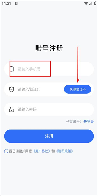 2、在注册账号页面填写手机号码后,点击获得验证码。